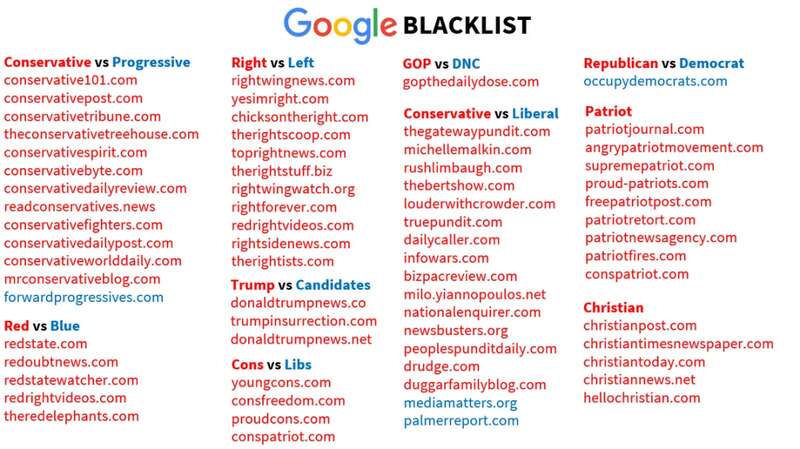 在這個(gè)特別的黑名單中,顯示了數(shù)百個(gè)在安卓的新聞搜索結(jié)果中被審查的保守派網(wǎng)站,存在明顯的政治偏見(jiàn)。