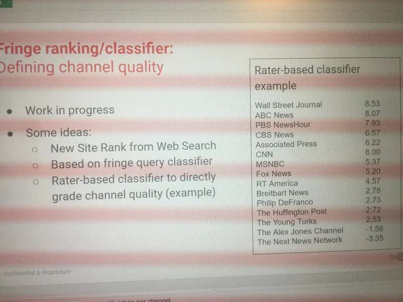 在一份被泄露的題為「邊緣排名/分類器: 定義頻道質(zhì)量」的文件中,谷歌將ABC、CBS和CNN評(píng)為比福克斯新聞、《今日俄羅斯》和Breitbart更權(quán)威的媒體。