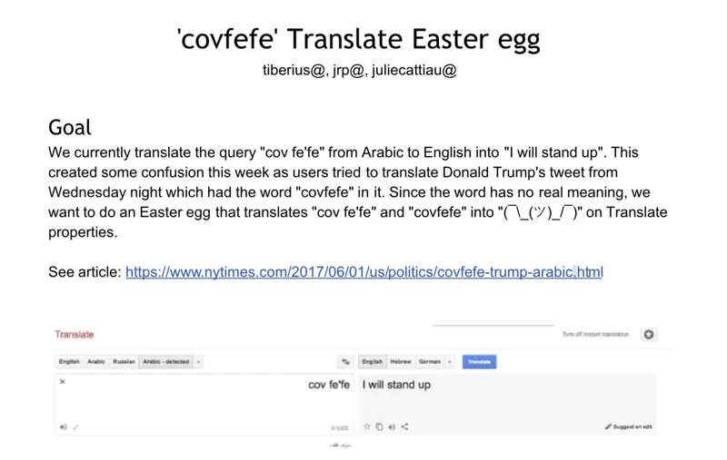 在一份被泄露的名為「covfefe Translate Easter egg」文件中,谷歌的工程師們甚至從阿拉伯語(yǔ)詞典中刪除了「covfefe」這個(gè)詞以及它的意思「I will stand up」,并用聳肩表情符號(hào)取而代之,以推進(jìn)他們的反特朗普政治議程?!?/p>
