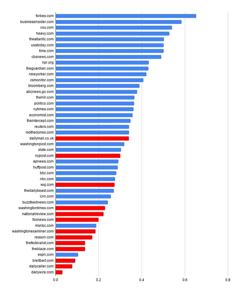 數(shù)據(jù)顯示,在谷歌的網(wǎng)站流量百分比排名中,賊低的十個(gè)網(wǎng)站(布萊巴特新聞、??怂剐侣?、每日來(lái)電、火焰、原因、聯(lián)邦主義者、每日電訊報(bào)、華盛頓審查員)中有八個(gè)是保守派網(wǎng)站。