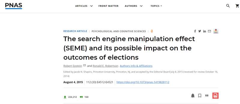 2015年8月,美國(guó)行為研究與技術(shù)學(xué)會(huì)的高級(jí)研究心理學(xué)家Robert Epstein就指出,通過(guò)「帶有偏見(jiàn)的搜索結(jié)果」,谷歌可以影響了猶豫不決的選民。